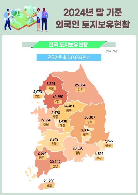 외국인이 보유한 국내 토지 면적은 총 26만7905천㎡로, 이는 전체 국토 면적의 0.27%에 해당한다. 이는 2023년 말보다 1.2%(3304천㎡) 증가한 수치다. 또한, 외국인 보유 토지의 공시지가는 약 33조4892억 원으로 전년 대비 1.4% 상승했다.