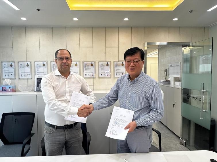 프리메딕 헤산 무라드 대표와 시노펙스 인공신상사업본부 이진태 본부장(오른쪽)이 수출 본계약 체결 뒤 기념사진을 촬영하고 있다/사진=시노펙스 제공