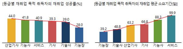 재취업에 걸리는 기간은 기능장이 39.2일로 가장 짧았으며, 기술사(48.8일), 산업기사(63.2일), 기사(66.8일), 기능사(88.3일), 서비스 분야(99.9일)가 뒤를 이었다.