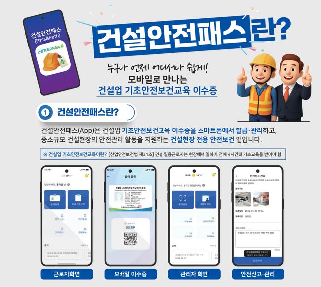 건설안전패스는 ‘기초안전보건교육 이수(Pass)’와 ‘안전한 길이 가장 빠른 길(Path)’이라는 의미를 담고 있다. 이 앱을 통해 근로자들은 별도의 플라스틱 카드 없이 스마트폰으로 교육 이수 사실을 증명할 수 있다.