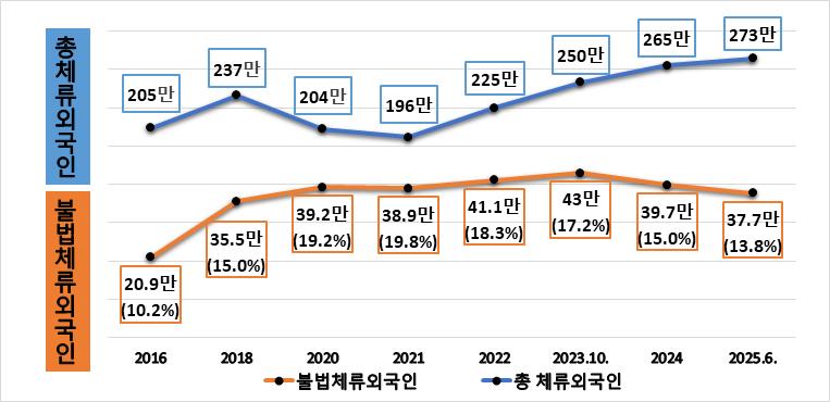 이로써 불법체류 외국인은 2023년 10월 43만 명에서 올해 6월 약 37만 명으로 감소했다.
