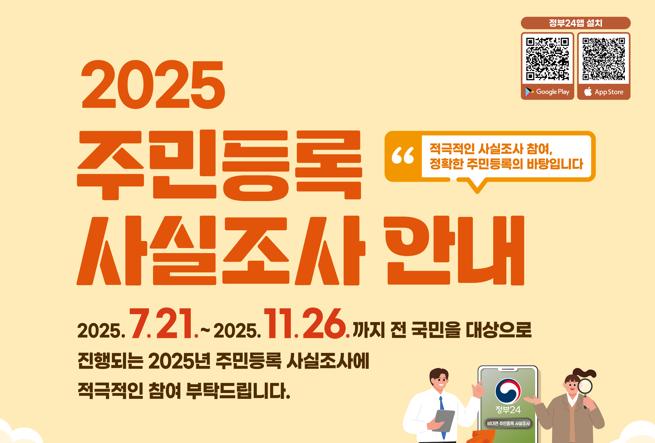 행정안전부가 7월 21일부터 10월 23일까지 전국민을 대상으로 ‘2025년 주민등록 사실조사’를 실시한다고 밝혔다.