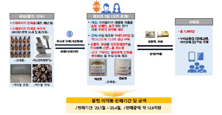 이들은 2023년 1월부터 2025년 4월까지 약 2년 4개월간 SNS를 통해 무허가 스테로이드 주사제 및 정제, 성장호르몬, 에페드린 등 총 2만3천여 개의 의약품을 불법 유통한 것으로 드러났다. 해당 의약품의 판매 금액은 약 12억 4천만 원에 달한다.