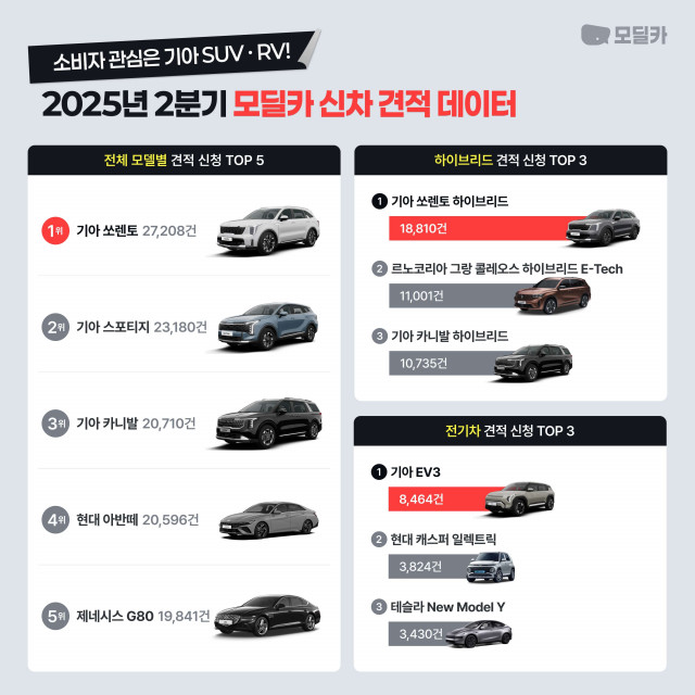 모빌리티 서비스 전문 기업 오토핸즈가 운영하는 신차 구매 플랫폼 ‘모딜카’가 2025년 2분기 소비자 신차 견적 데이터를 바탕으로 인기 차종 분석 결과를 24일 발표했다.