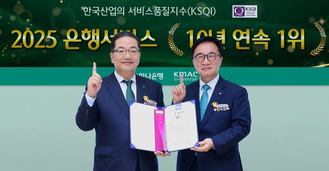 하나은행이 한국능률협회컨설팅(KMAC)이 주관하는 ‘2025년 한국산업의 서비스품질지수(KSQI)’에서 ‘고객 접점’ 부문 10년 연속 1위 은행에 선정됐다.