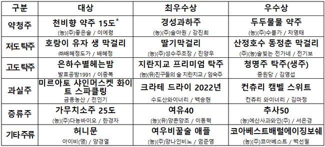 부문별 대상에는 △배혜정도가의 ‘호랑이 유자 생막걸리’(저도 탁주) △발효공방 1991의 ‘은하수별헤는밤’(고도 탁주) △금용농산의 ‘미르아토 샤인머스켓 화이트 스파클링’(과실주) △농업회사법인 다농바이오의 ‘가무치소주 25도’(증류주) △아이비영농조합법인의 ‘허니문’(기타 주류) 등이 각각 선정됐다.