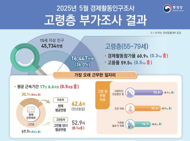 고령층 취업자의 근속기간도 늘어났다. 이들이 가장 오래 근무한 일자리에서의 평균 근속기간은 17년 6.6개월로 0.5개월 증가했다. 여전히 같은 일자리에 근무 중인 비율은 30.1%였으며, 이들의 현재 평균 연령은 62.6세로 집계됐다.
