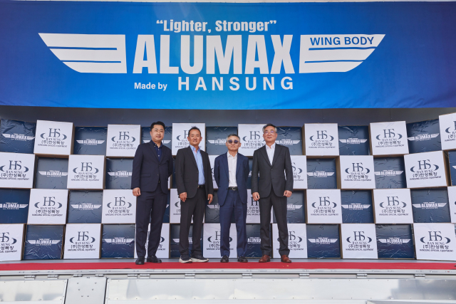 이상우 대표이사 등 한성특장의 주요 임원이 알루맥스 윙바디 차량에서 사진을 촬영하고 있다.