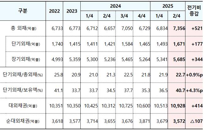 한국은행이 20일 발표한 ‘2025년 2분기 대외채권·채무 동향’에 따르면, 단기외채(만기 1년 이하)는 1671억달러로 전 분기보다 177억달러 확대됐고, 장기외채(만기 1년 초과)도 5685억달러로 344억달러 증가했다.