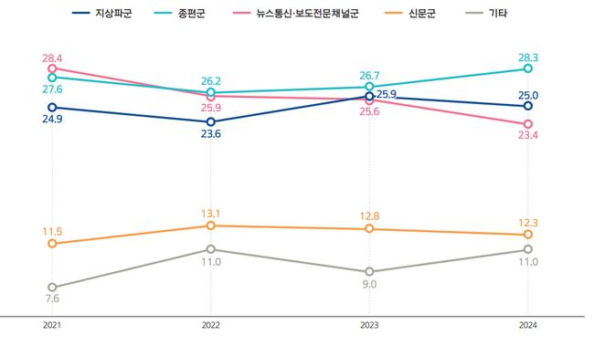 지상파군은 25.0%로 안정세를 보였고, 뉴스통신·보도전문채널군은 23.4%로 2021년 28.4%에서 크게 줄었다.