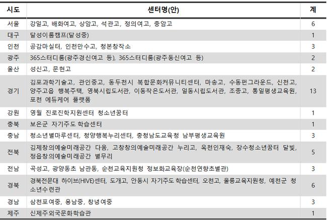 대구, 강원, 충북, 제주 등은 1곳씩 포함됐다. 센터 공간은 학교복합시설, 도서관, 청소년센터 등 다양한 형태로 마련된다.