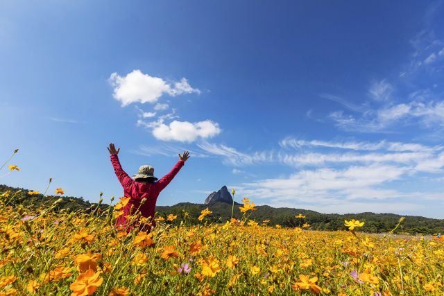 진안 마이산을 배경으로 보이는 코스모스 군락지/사진=승우여행사