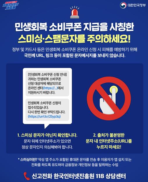 정부가 2차 민생회복 소비쿠폰 신청·지급 시기를 앞두고 소비자들에게 스미싱 범죄에 대한 각별한 주의를 당부했다.