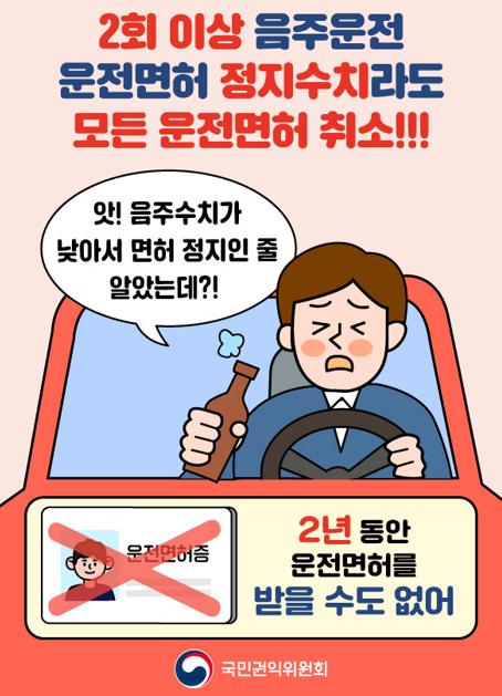 도로교통법은 2001년 6월 30일 이후 2회 이상 음주운전을 한 경우, 혈중알코올농도가 면허 정지 수준(0.030% 이상 0.080% 미만)에 해당하더라도 모든 운전면허를 반드시 취소하도록 규정하고 있다. 또한, 음주 측정 거부 전력이 있는 사람이 정지 수치로 적발될 경우에도 동일하게 취소 처분을 받게 된다.