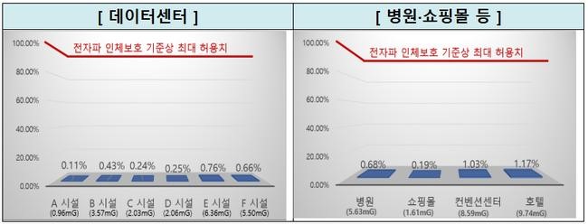 조사 대상은 데이터센터 6곳과 병원·쇼핑몰 등 다중이용시설 4곳으로, 모두 국제 비전리방사선보호위원회(ICNIRP) 기준을 준용한 국내 인체보호 기준 대비 매우 낮은 수준의 전자파를 기록했다.
