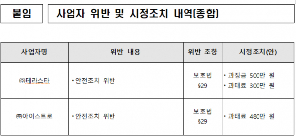 위원회는 화장품 등 생활필수품을 판매하는 통신판매업체 테라스타(이전 사명 에이쓰리글로벌)에 과징금 500만 원과 과태료 300만 원을, 제빙기 등 냉동식품 기기 제조업체 아이스트로에 과태료 480만 원을 각각 부과했다.