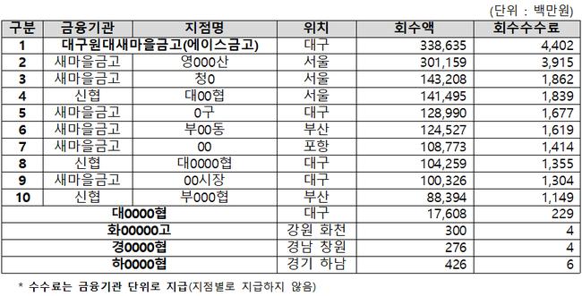 이 기간 금융기관 1곳당 평균 수수료는 약 2000만 원 수준이었으나, 대구의 한 새마을금고는 44억 원을 챙겨 전국 1위를 기록했다. 이는 금융기관 평균의 약 220배, 전체 지급액의 5.7%에 해당한다.