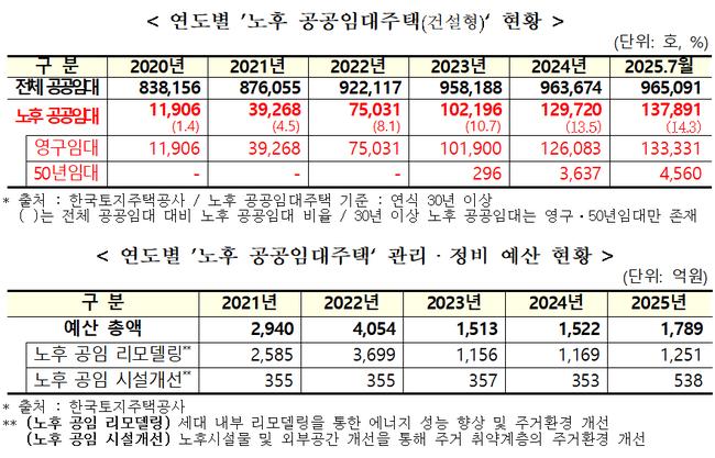 하지만 정부의 노후 공공임대 관리·정비 예산은 급증하는 주택 수를 따라가지 못하고 있다. 관련 예산은 2022년 4054억 원에서 2023년 1513억 원으로 대폭 줄었으며, 2024년 1522억 원, 2025년 1789억 원으로 정체된 상태다.
