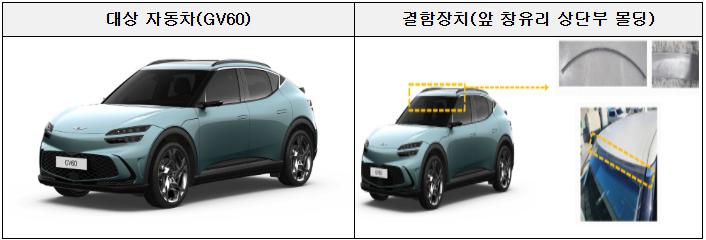 또한, GV60 1만617대는 앞 유리 상단부 몰딩(자동차 외관의 미관 향상 및 손상 방지를 위한 띠 모양의 부품)의 제조 불량으로 주행 중 몰딩이 이탈할 우려가 있어 10월 22일부터 리콜이 진행된다.