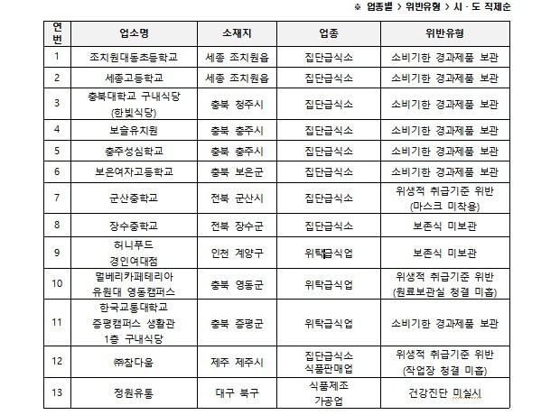 주요 위반 내용은 ▲소비기한 경과 제품 보관(9건) ▲원료보관실 청결 미흡 등 위생적 취급기준 위반(3건) ▲보존식 미보관(2건) ▲건강진단 미실시(1건)으로 나타났다.