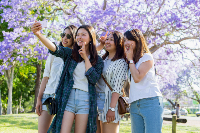 보라빛 자카란다와 인증샷을 찍는 관광객/사진=호주뉴사우스웨일즈주관광청 제공