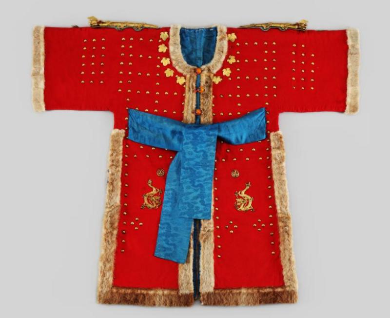 갑옷은 홍색 전과 청색 운보문단으로 제작된 두루마기형 전갑의 형태로, 좌우대칭이며 소매가 짧고 양 옆이 트여 있어 활동이 편리하다. 겉감에는 금속 둥근 두정 장식을 일정 간격으로 부착하고, 사조룡과 호랑이 형상, 여의주 등을 장식하였다. 특히 양 어깨의 용 형태 견철은 네 마디로 나뉘어 입과 혀가 움직이도록 정교하게 제작됐다.