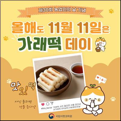 농촌진흥청이 11월 4일부터 11일까지 ‘올해도 11월 11일은 가래떡데이!’를 주제로 쌀 소비 촉진 온라인 행사를 진행한다고 밝혔다.