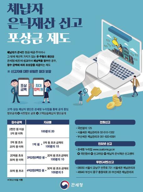 신고 포상금 제도는 체납자의 은닉재산 신고를 활성화하기 위해 2022년부터 포상금 지급률을 상향(징수금액 2천만~5억 원: 20%)했으며, 올해 5월에는 은닉재산 제보자에게 1천만 원의 포상금을 지급한 사례도 있다.