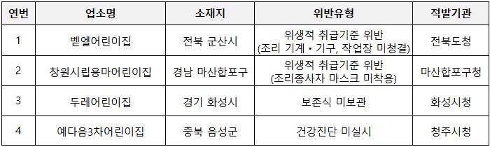 식품의약품안전처는 영유아 집단급식 시설의 식중독 예방을 위해 전국 어린이집 3892곳을 대상으로 위생점검을 실시한 결과, 「식품위생법」을 위반한 4곳을 적발하고 관할 지자체에 행정처분을 요청했다고 20일 밝혔다.
