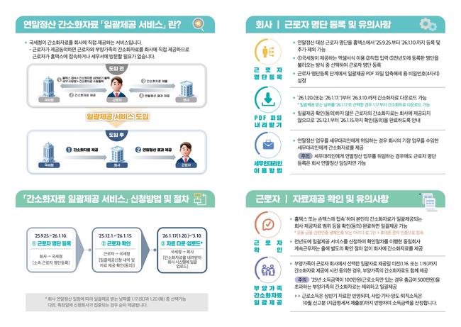 올해 1차 신청기한은 11월 30일까지이며, 지난해에는 약 7만7천 개 회사와 270만 명의 근로자가 서비스를 이용해 서류 제출 절차를 간소화하고 연말정산 집중 시기 시스템 과부하를 줄이는 효과를 거뒀다.