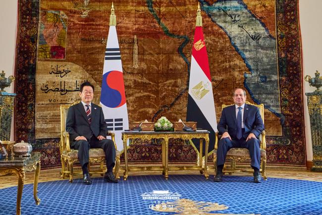 이집트를 공식 방문 중인 이재명 대통령이 20일(현지시간) 카이로 대통령궁에서 압델 파타 알시시 대통령과 한·이집트 단독 정상회담을 하고 있다/사진=대통령실 제공