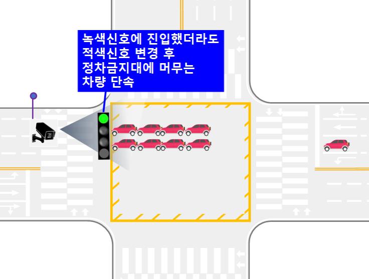 단속 대상은 정차금지지대가 설치된 교차로에서 녹색 신호에 진입했으나, 신호가 적색으로 바뀐 뒤에도 정차금지구역을 벗어나지 못한 차량이다. 다만, 사고나 차량 고장 등 불가피한 사유가 인정될 경우 단속 대상에서 제외된다.