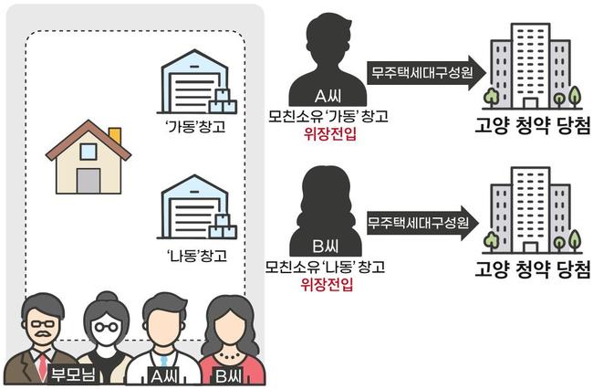국토부는 형제간 인접 창고에 허위 전입신고 후 추첨제로 당첨된 사례, 배우자를 장인·장모 집에 위장전입시켜 부양가족 가점을 받아 당첨된 사례 등을 주요 사례로 공개했다.