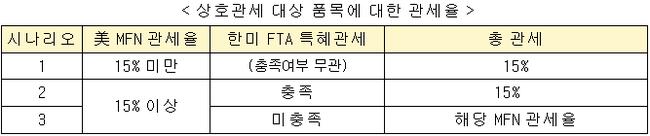 상호관세가 부과되던 품목은 기존 MFN 관세율에 일괄 15%가 추가돼 왔지만, 이번 조정에 따라 MFN 관세가 15% 미만인 경우 총 15%만 적용된다. MFN 15% 이상 품목도 한미 FTA 요건을 충족하면 동일하게 15% 관세만 부과된다. FTA 요건을 충족하지 못할 경우 기존 MFN 관세율이 유지된다.
