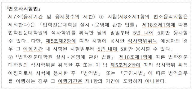 현행 「변호사시험법」 제7조는 2009년 제정 당시부터 변호사시험 응시기회를 법학전문대학원 졸업 후 5년간 5회로 제한하고 있으며, 예외사유로는 병역의무 이행만을 인정하고 있다.
