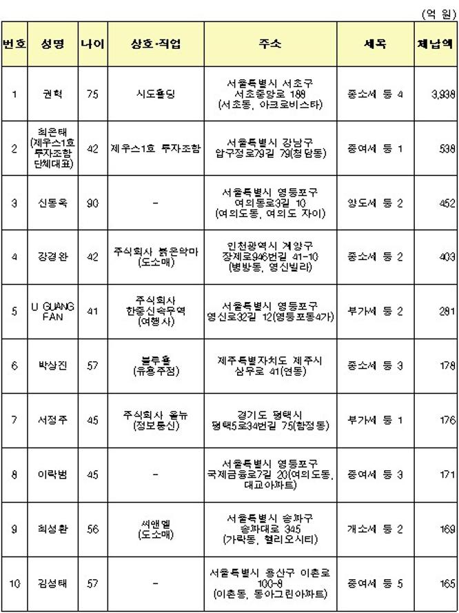 고액・상습체납자 신규 명단공개 대상자(체납액 상위 개인 10위)/자료제공=국세청
