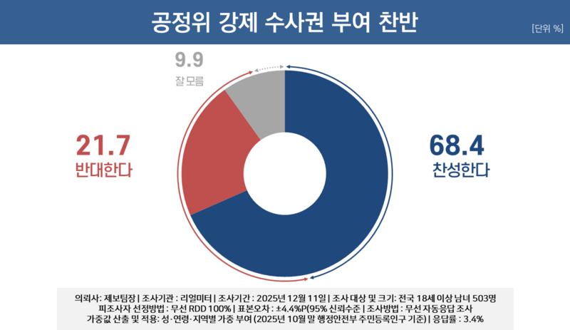 이번 조사는 2025년 12월 11일 전국 만 18세 이상 남녀를 대상으로 무선전화(100%) 무작위 생성 표집틀을 활용한 임의 전화걸기(RDD) 자동응답조사 방식으로 실시됐다. 전체 응답률은 3.4%이며, 최종 응답자는 503명이다. 표본오차는 95% 신뢰수준에서 ±4.4%포인트다.