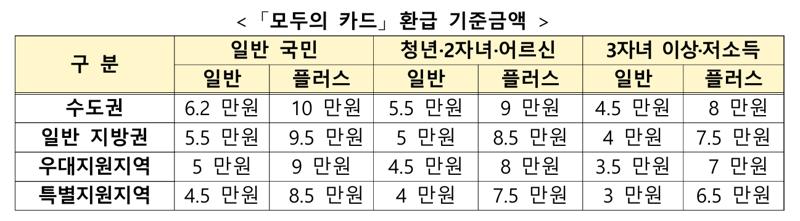 일반 국민 기준으로 수도권의 환급 기준금액은 일반형 6만2천 원, 플러스형 10만 원이며, 일반 지방권은 각각 5만5천 원과 9만5천 원이다. 청년·2자녀 가구·어르신은 수도권 기준 일반형 5만5천 원, 플러스형 9만 원이 적용되고, 3자녀 이상 가구와 저소득층은 일반형 4만5천 원, 플러스형 8만 원으로 기준이 낮아진다.