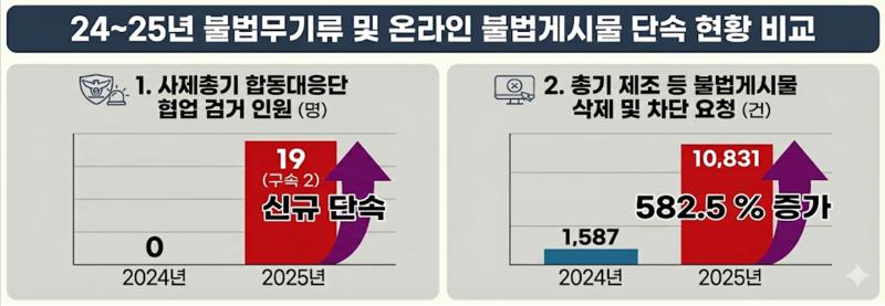 경찰청은 국내 불법 무기류 단속을 지속적으로 강화하고 있다. 불법 무기류 단속 인원은 2024년 102명에서 2025년 112명으로 증가했으며, 온라인상 총기 제조 관련 불법 게시물에 대한 삭제·차단 요청도 같은 기간 1587건에서 1만 831건으로 대폭 늘었다.