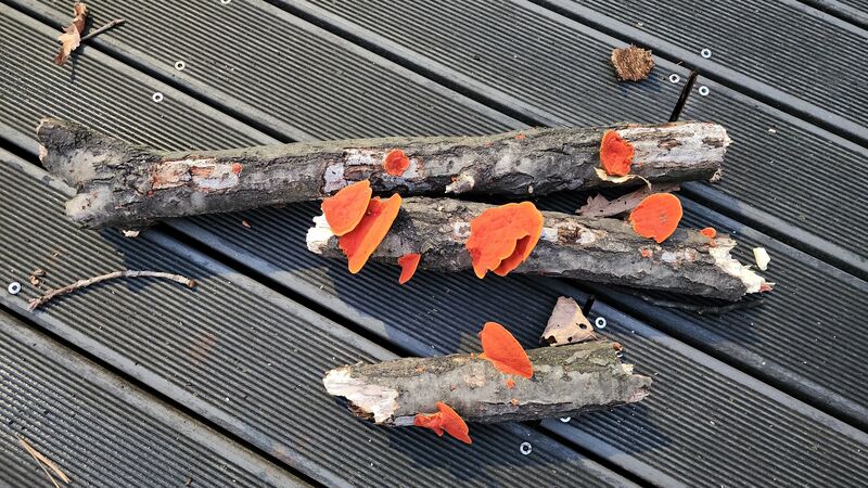 10일 강풍으로 꺽여 떨어진 참나무 가지 위 '붉은 간버섯' 모습/사진=경제엔미디어