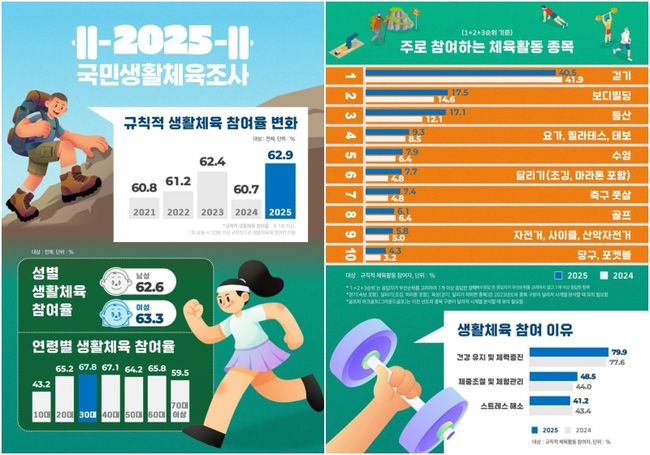 문화체육관광부는 만 10세 이상 국민 9천 명을 대상으로 실시한 ‘2025년 국민생활체육조사’ 결과, 생활체육 참여율이 62.9%로 전년 대비 2.2%포인트 상승했다고 밝혔다. 참여 빈도와 1회 평균 운동 시간, 참여 기간 등 주요 지표도 모두 증가한 것으로 조사됐다.