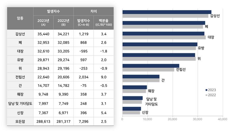 보건복지부와 중앙암등록본부는 20일 이 같은 내용을 담은 ‘2023년 국가암등록통계’를 발표했다. 이번 통계는 「암관리법」에 따라 전국 의료기관의 진료기록을 토대로 암 발생, 생존, 유병 현황을 종합 분석한 결과다.