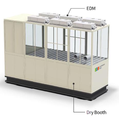 생산설비 상부 또는 드라이부스에 설치 가능한 EDM(Equipment Dehumidify Module)은 EFU(Equipment Fan Filter Unit) 적용이 가능해 공간 활용성이 뛰어나며, 파티클 제거와 절대습도 저감을 동시에 구현할 수 있다. SDU(Stand Dehumidifier Unit)는 드라이부스 또는 드라이룸 내부에 자립형으로 설치되는 고풍량 제습 장비로, 대용량 공기 처리가 필요한 공정에 적합하다.