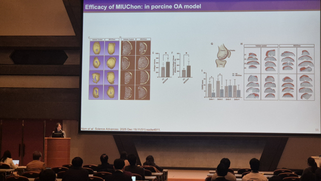임 교수는 발표에서 MIUChon의 임상 투여 전략과 함께 무작위 대조·위약 대조·이중맹검(randomized, placebo-controlled, double-blind) 설계를 기반으로 한 임상 연구 구조를 설명하고, 이를 통해 확보된 안전성 및 유효성 평가 결과를 제시했다. 특히 MRI 기반 연골 구조 변화 분석, 통증 감소, 관절 기능 개선 등 주요 임상 지표를 중심으로 연구 결과를 체계적으로 소개했다.