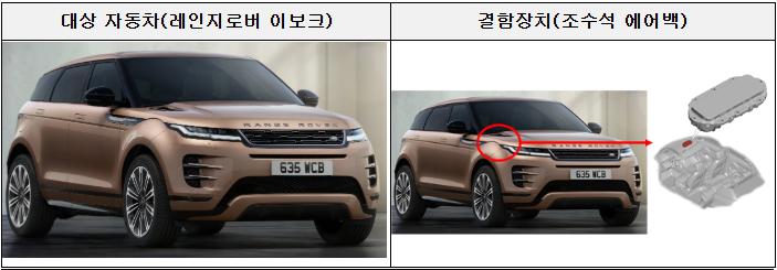 재규어랜드로버코리아는 레인지로버 이보크 1416대에서 조수석 에어백 조립 불량이 확인됐다. 해당 결함으로 에어백 전개 시 에어백이 손상돼 탑승자가 상해를 입을 우려가 있어 지난 23일부터 시정조치를 진행 중이다.