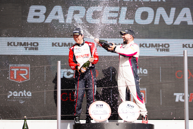 박준성 선수가 2025 TCR 유럽 최종전 우승 후 샴페인 세레모니를 펼치고 있다/사진=현대성우쏠라이트 제공