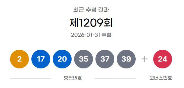 추첨 결과 1등 당첨번호는 '2, 17, 20, 35, 37, 39‘ 이며, 1게임당 13억7191만 원씩의 당첨금을 받는다.