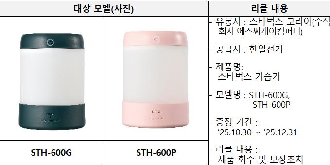 리콜 대상은 모델명 STH-600G와 STH-600P로, 2025년 10월 30일부터 12월 31일까지 소비자에게 증정된 스타벅스 가습기 39만3548대 전량이다. 해당 제품은 전지로 인한 화재 발생 우려가 제기됐다.