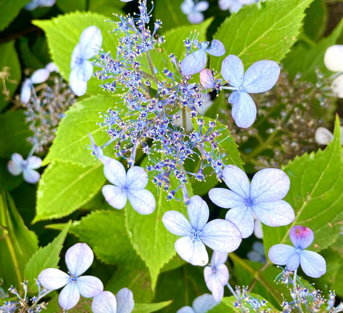 꽃은 7~8월, 당해에 자란 가지 끝에 큰 편평꽃차례 형태로 핀다. 꽃차례에는 지름 2~3cm의 무성꽃과 다수의 양성꽃이 함께 달린다. 무성꽃은 꽃받침조각이 꽃잎처럼 발달해 3~5개로 이루어지며 청색 또는 자주색을 띤다.