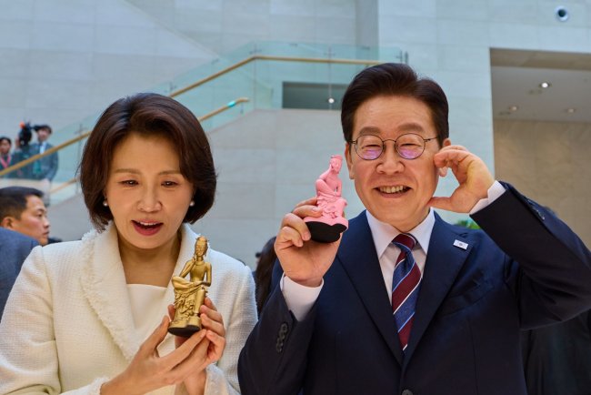 이재명 대통령과 김혜경 여사가 26일 서울 용산구 국립중앙박물관에서 열린 특별전 ‘우리들의 이순신’을 관람한 뒤 상품관에서 기념품과 함께 기념촬영을 하고 있다/사진=청와대